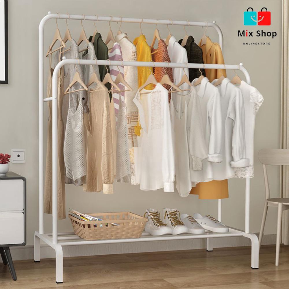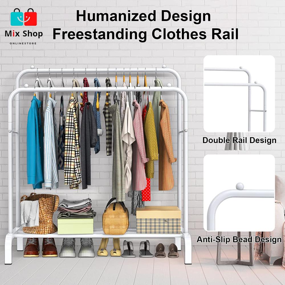 يأتي الحامل بقضبان تعليق طويلة تكفي لتنظيم ملابسك اليومية، مما يساعد في تجنب فوضى تناثر الملابس في الغرفة. كما يحتوي على رف سفلي عريض يمكن استخدامه لتخزين الأحذية، الحقائب، القبعات، والعديد من الأشياء الأخرى.
