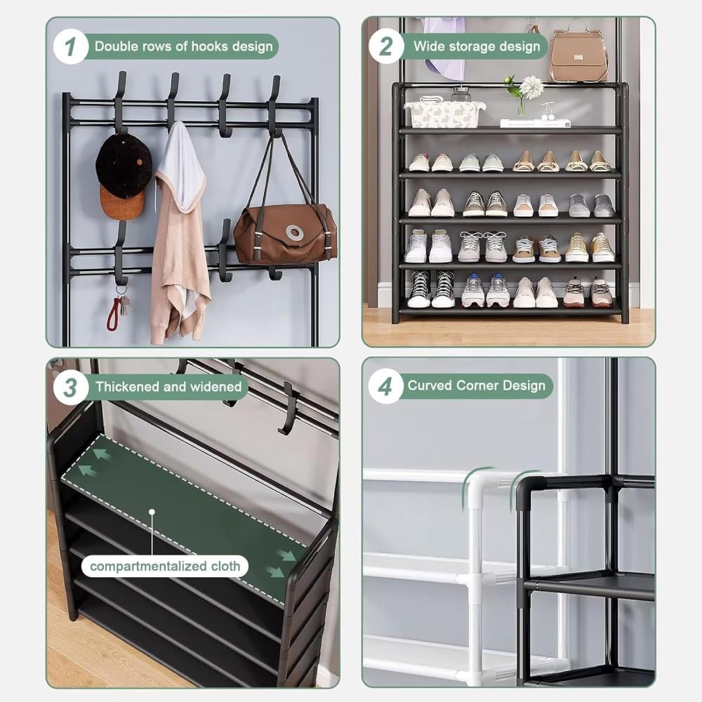 يتميز رف الأحذية بتصميم ثلاثي يجمع بين رف مكون من 5 أرفف للأحذية، حامل معاطف، وخطافات لتعليق القبعات والملابس، مما يجعله حلًا شاملاً لتخزين الأحذية والأغراض الشخصية الأخرى. يتسع هذا الرف لـ15-20 زوجًا من الأحذية مع توفير خطافات متعددة للقبعات والإكسسوارات.