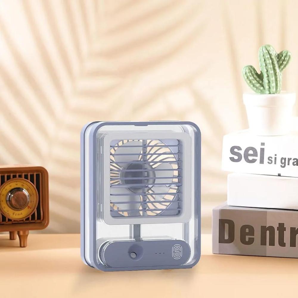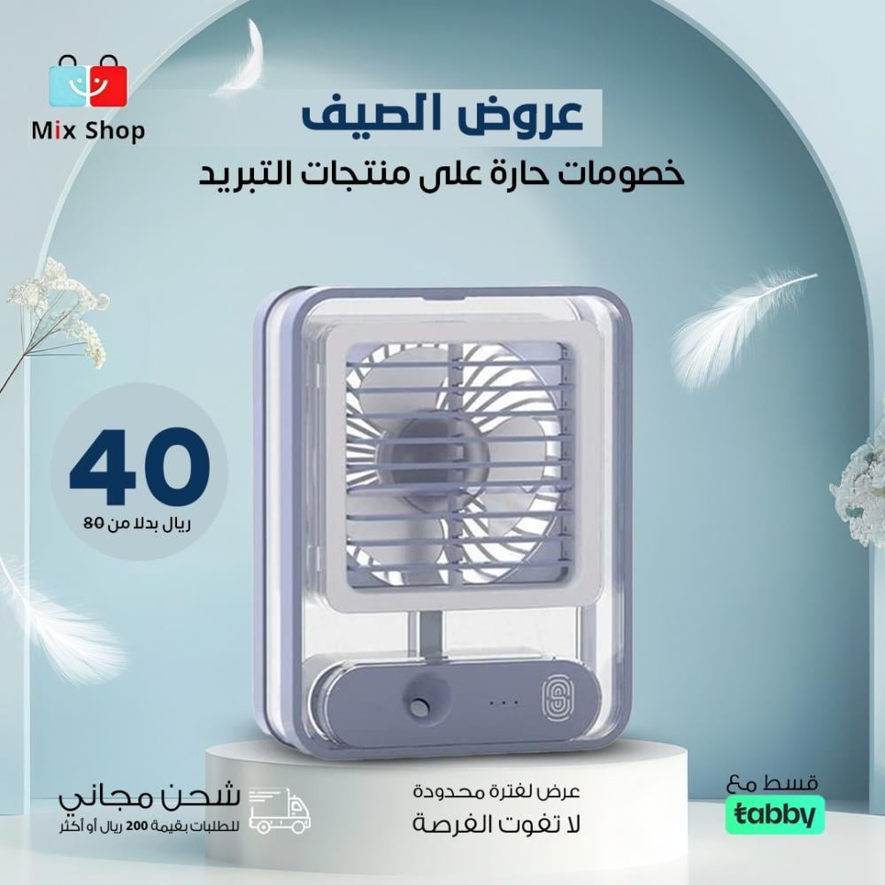 مروحة هواء صغيرة ومحمولة تعمل بالشحن لتبريد وترطيب الهواء مع 3 سرعات للتبريد و رش رذاذ الماء