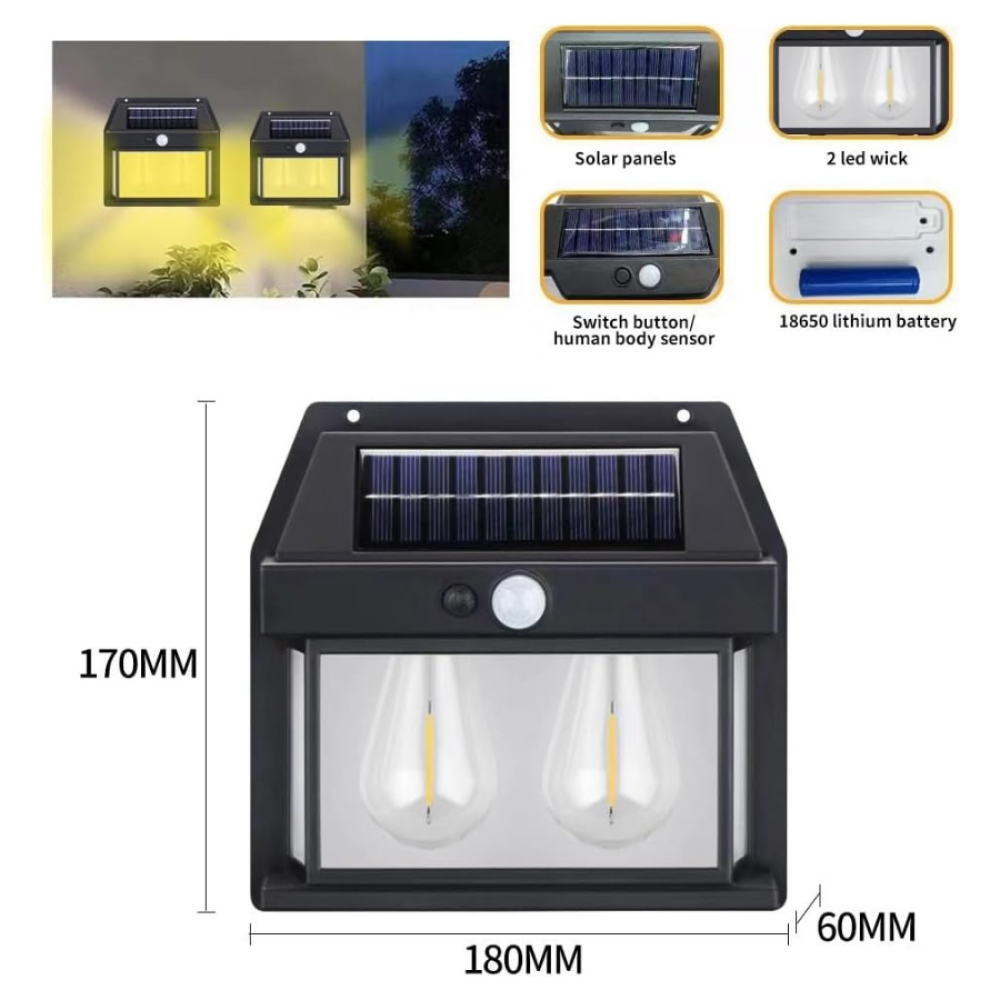 - بفضل تصميمه الذي يعتمد بالكامل على الطاقة الشمسية، لا يتطلب المصباح أي توصيلات كهربائية معقدة. يمكنك تركيبه ببساطة على أي جدار باستخدام الأدوات المتوفرة في العبوة، وهو مثالي للمناطق التي تفتقر إلى مصادر الطاقة مثل الحدائق، المخيمات، والمناطق الريفية.